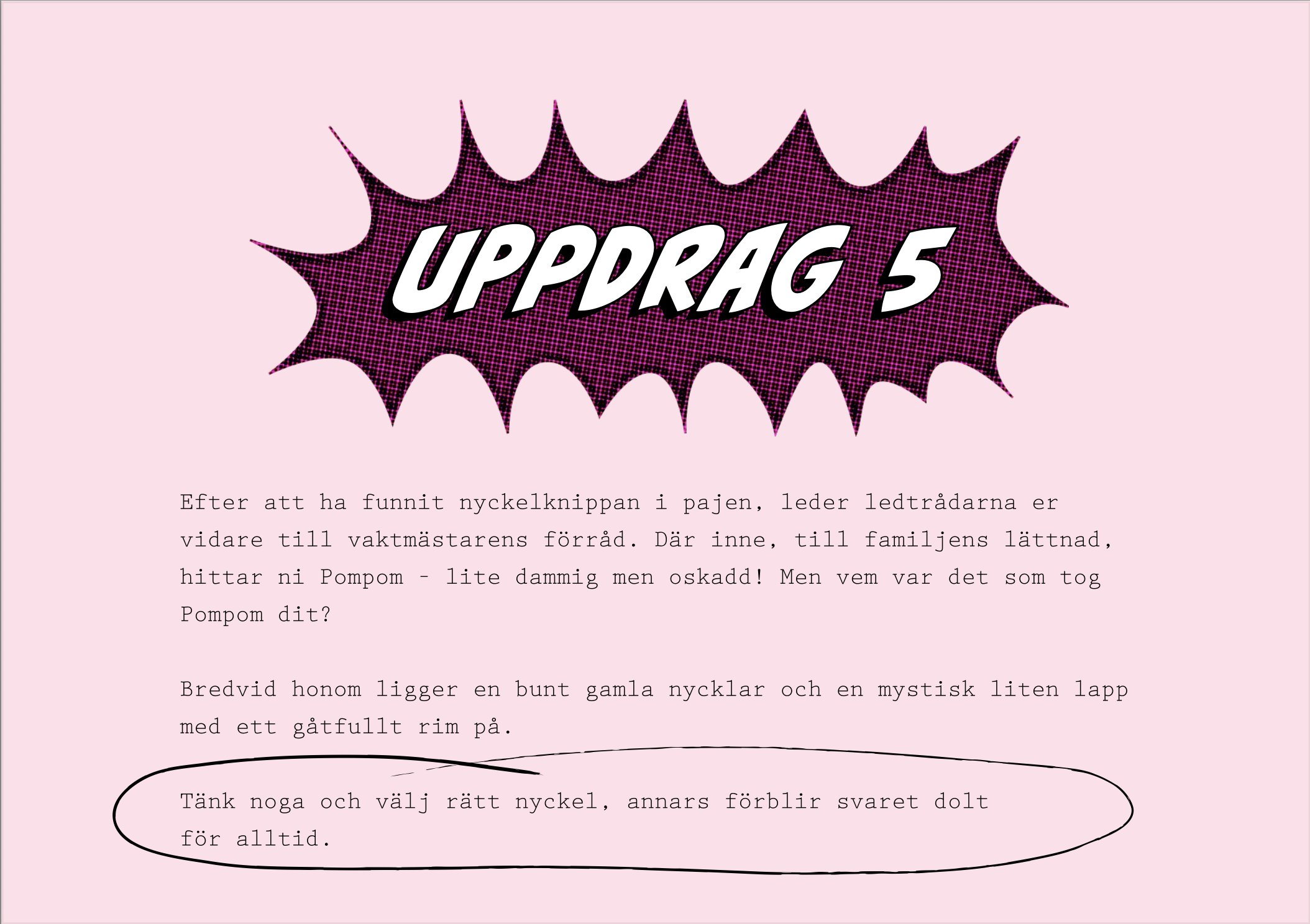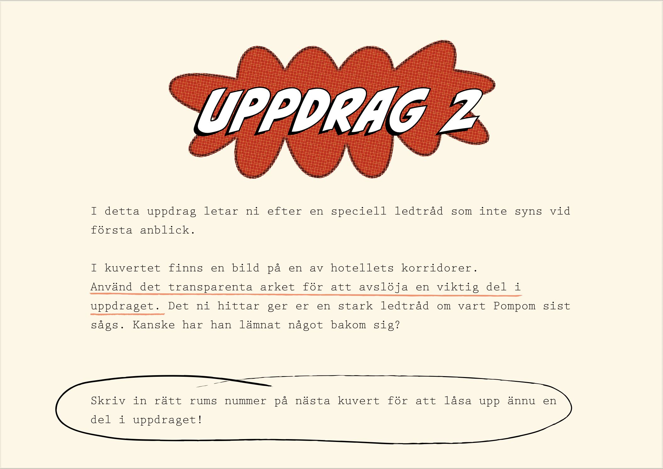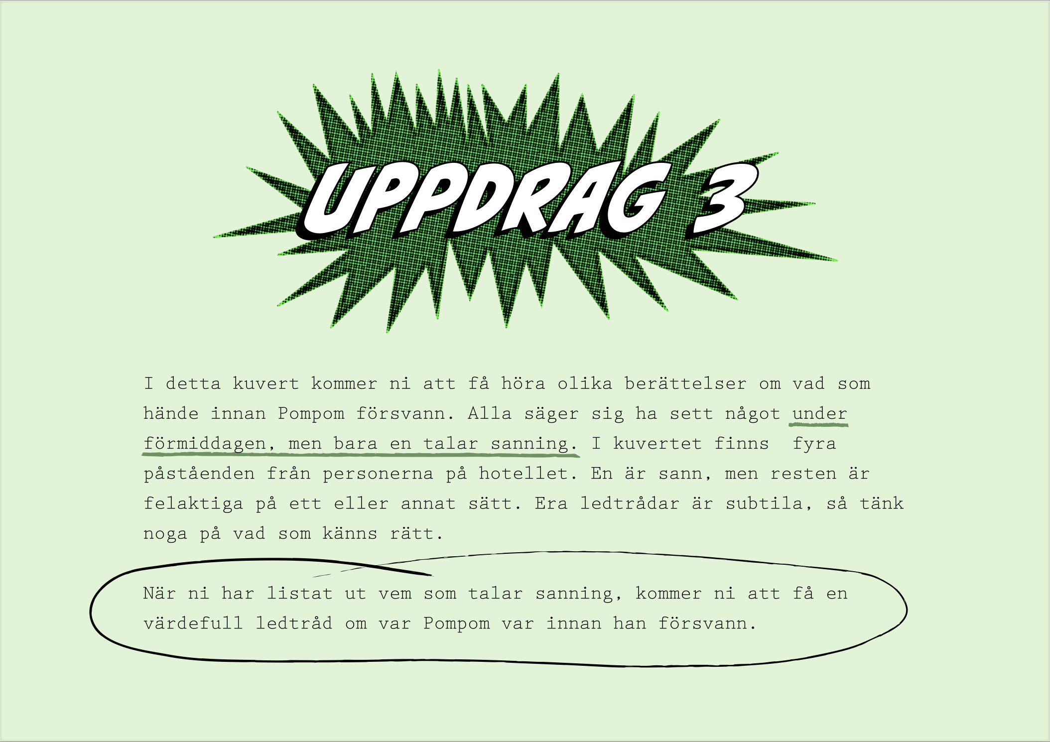 2. Lös uppdragen i rätt ordning. Varje uppdrag leder er vidare i jakten på Pom Pom. När ni löst en del, öppnar ni nästa kuvert.