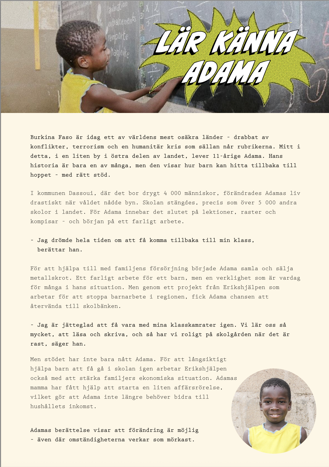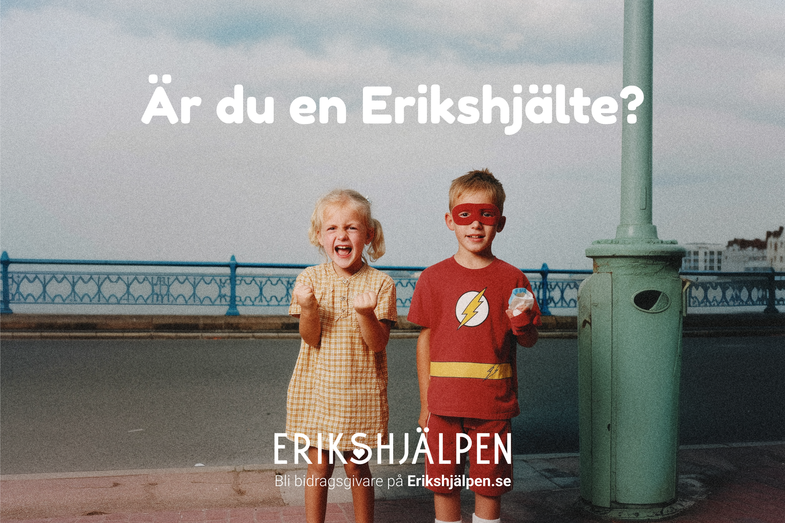 Alla kan bli en hjälte med Erikshjälpen. Genom den nya givarformen och prenumerationen Erikshjältar får familjer hjälteuppdrag att lösa tillsammans – en lekfull väg att både lära sig om barns rättigheter och göra skillnad.
