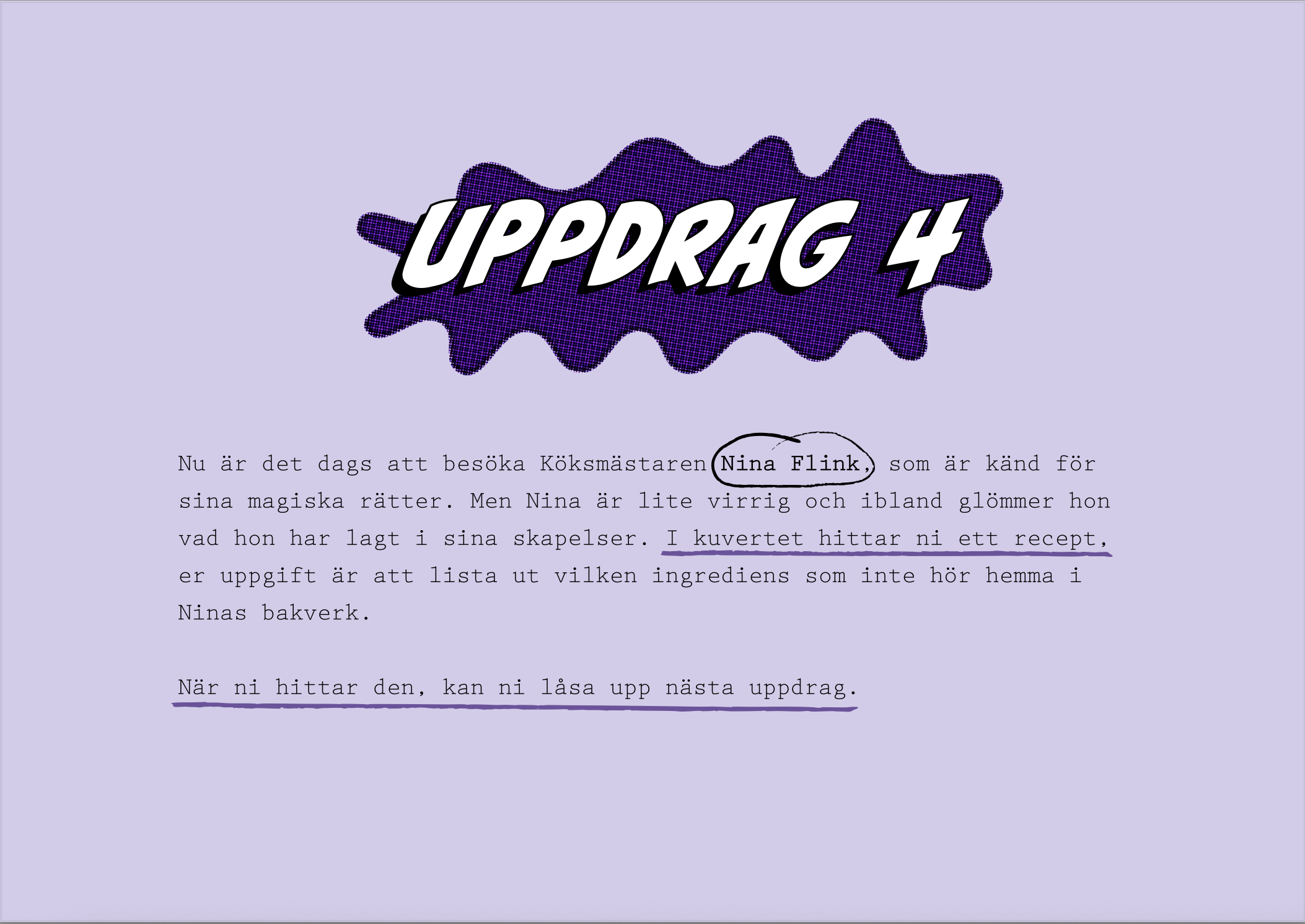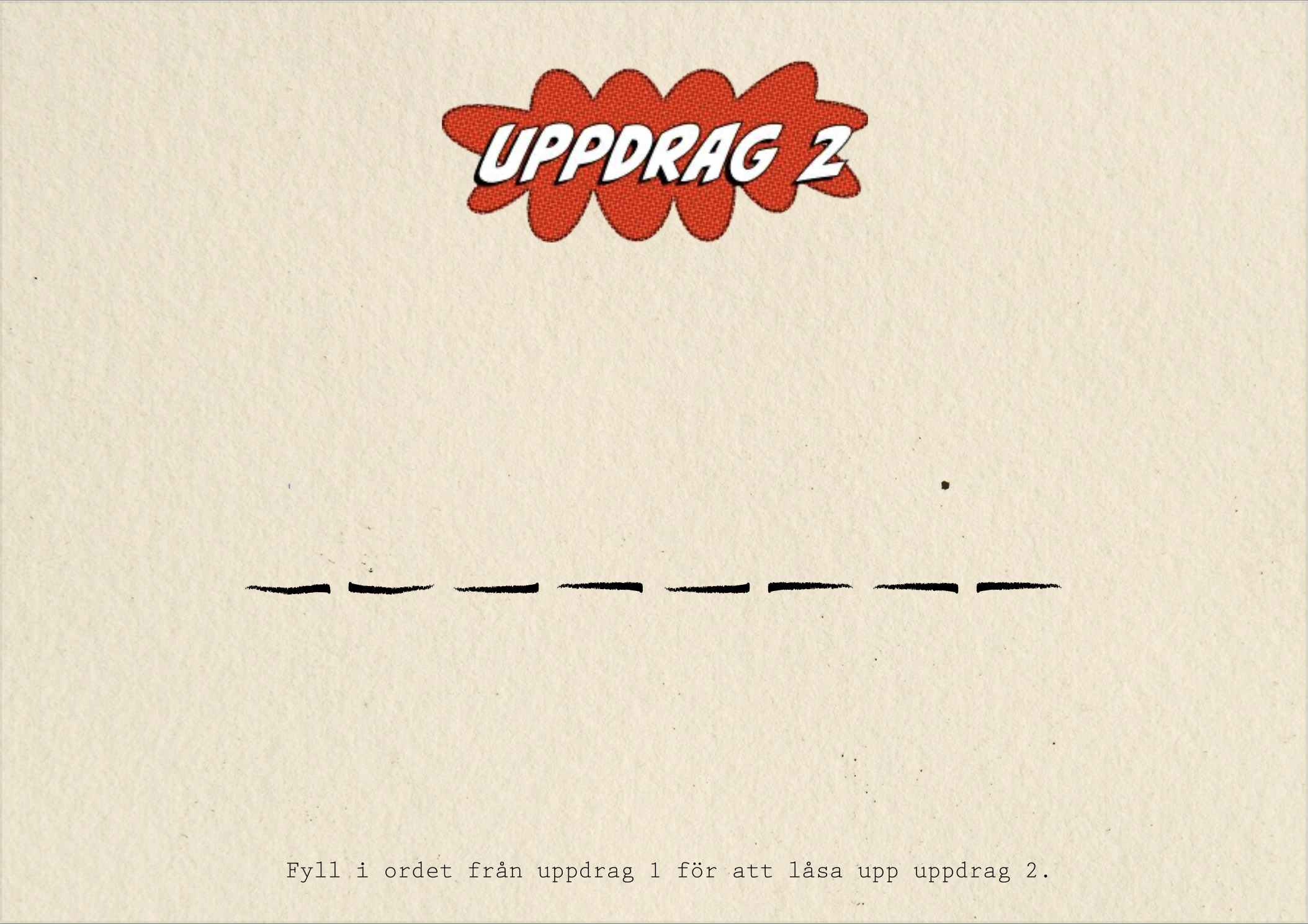 1. Öppna det första kuvertet. Där hittar ni ledtrådar, föremål och ert första uppdrag. Följ instruktionerna noga.