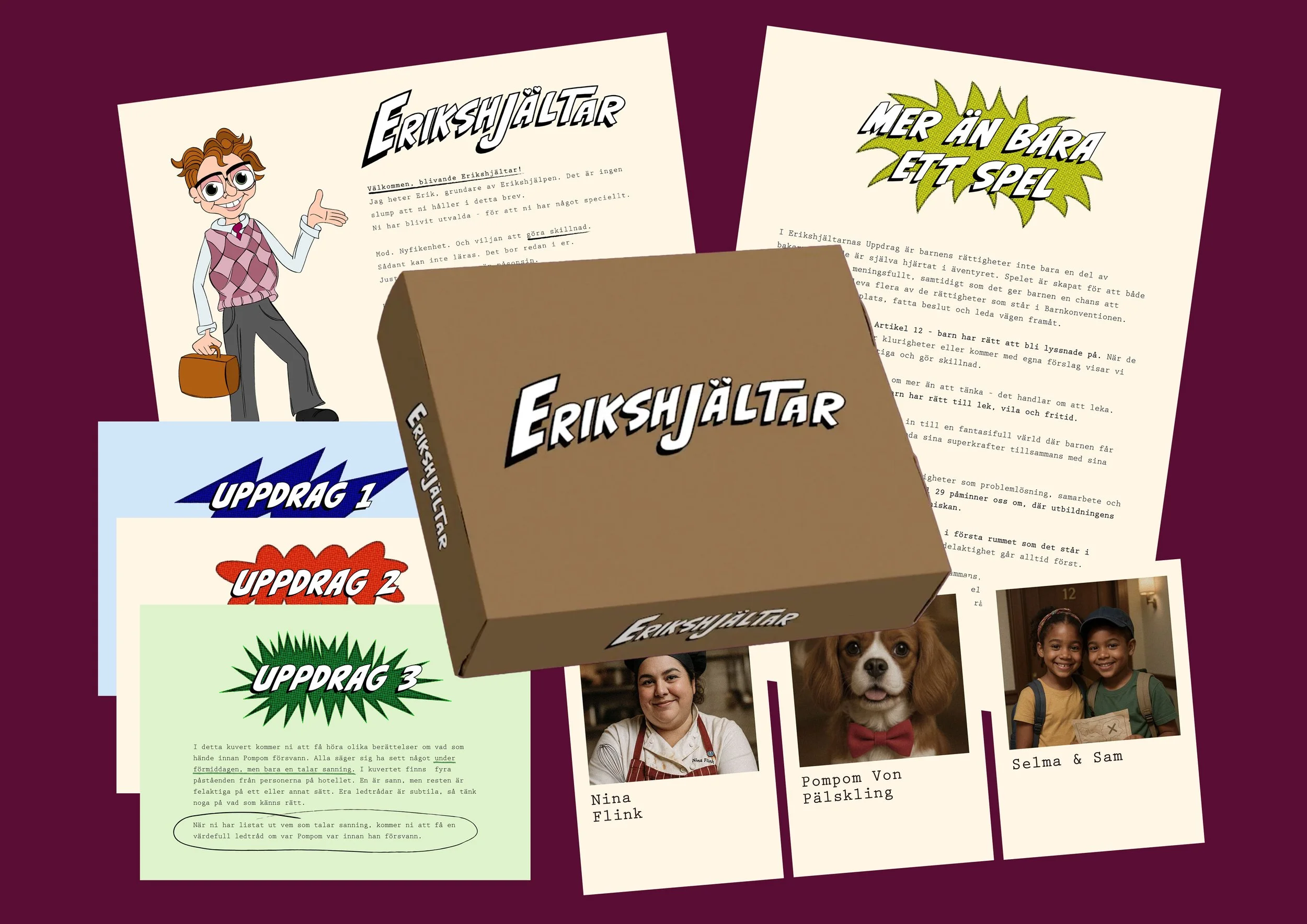 Vi skapade Erikshjältarnas uppdrag, ett prenumerationsäventyr där barn får hemliga hjälteuppdrag hem i brevlådan varje månad. Uppdragen är kopplade till barnkonventionen och utformade för att göras tillsammans med en vuxen. De är lekfulla, tankeväckande och bygger på att barn får öva på att påverka, känna empati och stå upp för sig själva och andra.